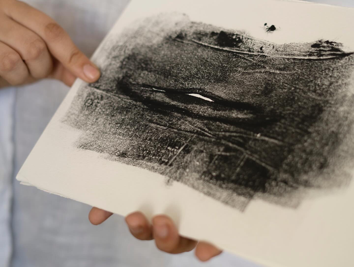 Exploración en torno al pliegue cutáneo abdominal, el cual, mediante la acción repetitiva de entintado sobre el cuerpo, se pliega y repliega sobre el papel, generando una serie no idéntica donde el vacío de la forma cambia constantemente. Esta zona corresponde a una de las nueve áreas donde se mide el -supuesto- exceso de grasa corporal, convirtiéndose en un punto de biocontrol. Sin embargo, el ombligo también grafica el origen y el nexo, la conexión entre el adentro y el afuera, el umbral. Este proceso germinó en la Residencia Cuerpos, trayectorias y temporalidades del Sur, guiada por Marcela Hurtado. Exhibido en Bordes Fluidos (2024), BAJ Antofagasta bajo la curatoria de Jorge Wittwer. Fotografías: Constanza Rutherford y archivo propio.