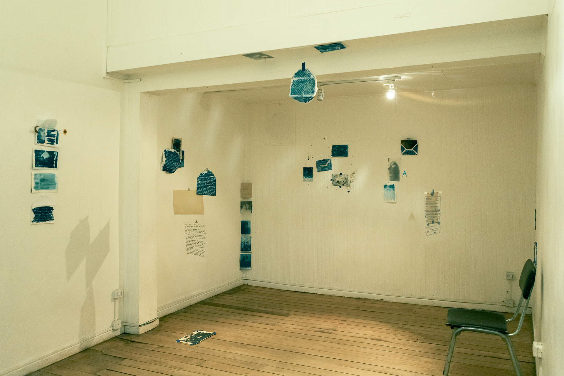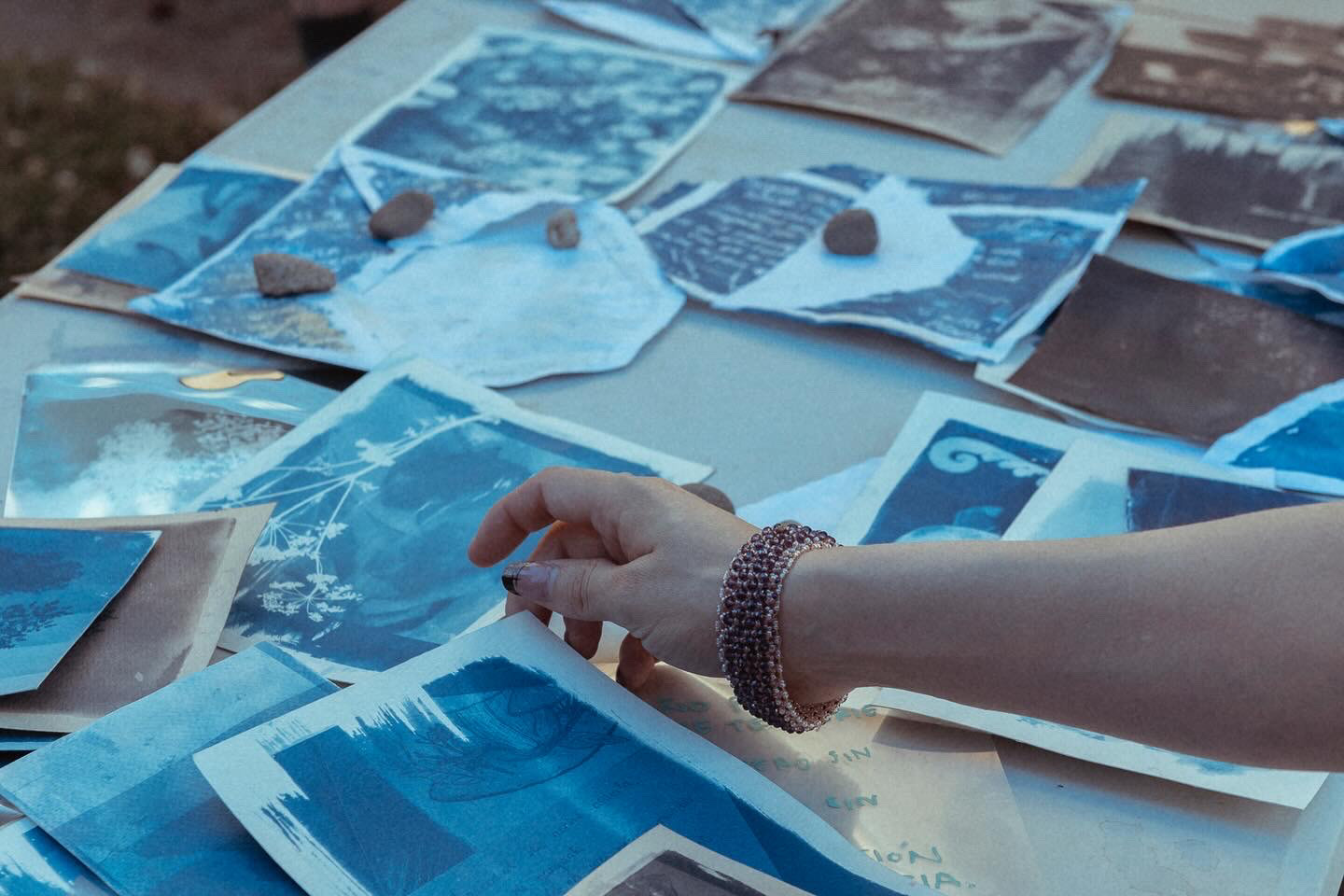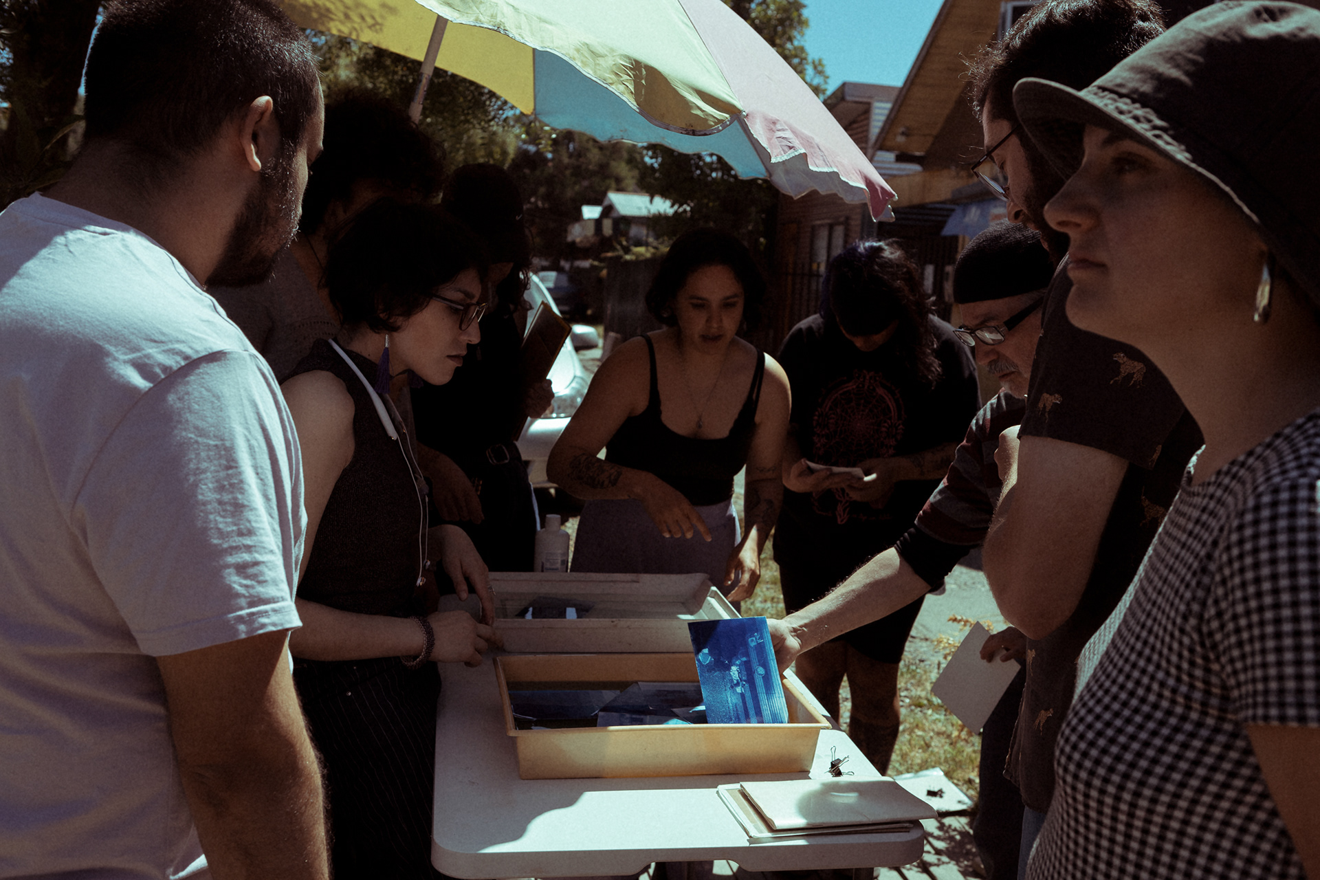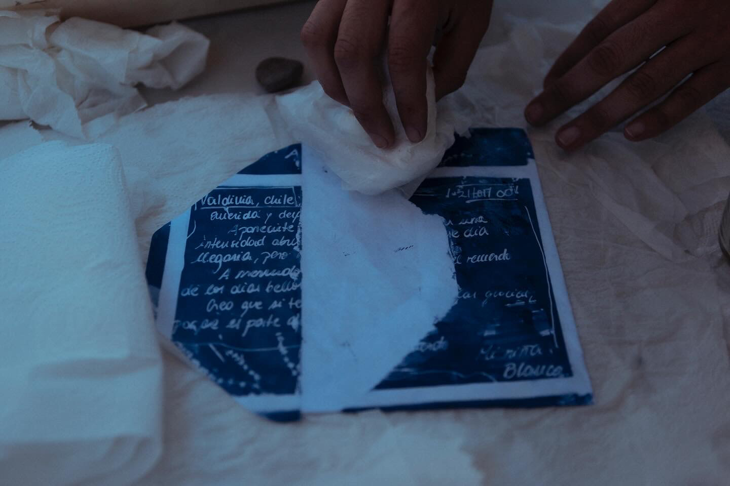 Experiencia de creación en torno a la noción de curar, vinculada al sanar y al curatoriar, que implica crear un relato, seleccionar las penas y prepararlas en conjunto. Para ello, se realizó una serie de sesiones grupales, culminando con una sesión abierta y extendida en Galería Barrios Bajos. En este espacio de creación colectiva, nos reunimos para abordar la tristeza a través del archivo personal, generando imágenes reveladas e intervenidas mediante cianotipia, creando un universo azul que surgió del aprendizaje de la técnica, el diálogo y la escucha atenta, la escritura, así como del ejercicio curatorial, acompañado de la toma y utilización de té como brebaje vincular. Autoras/es y facilitadoras/es: Fabiola Pontigo, Gabriel Correa y Valentina Inostroza.