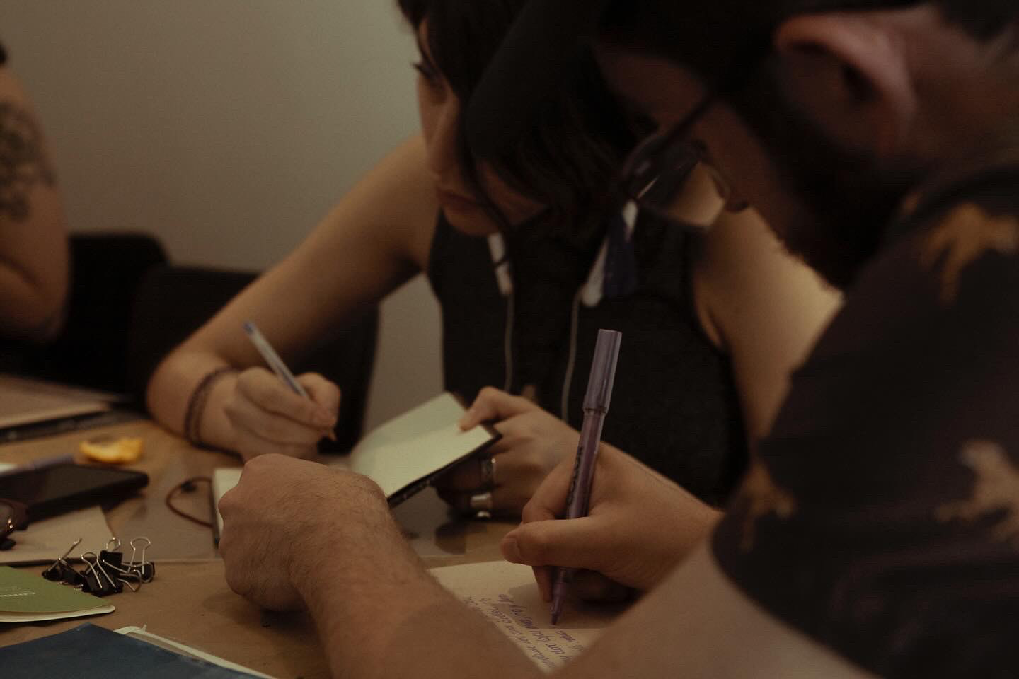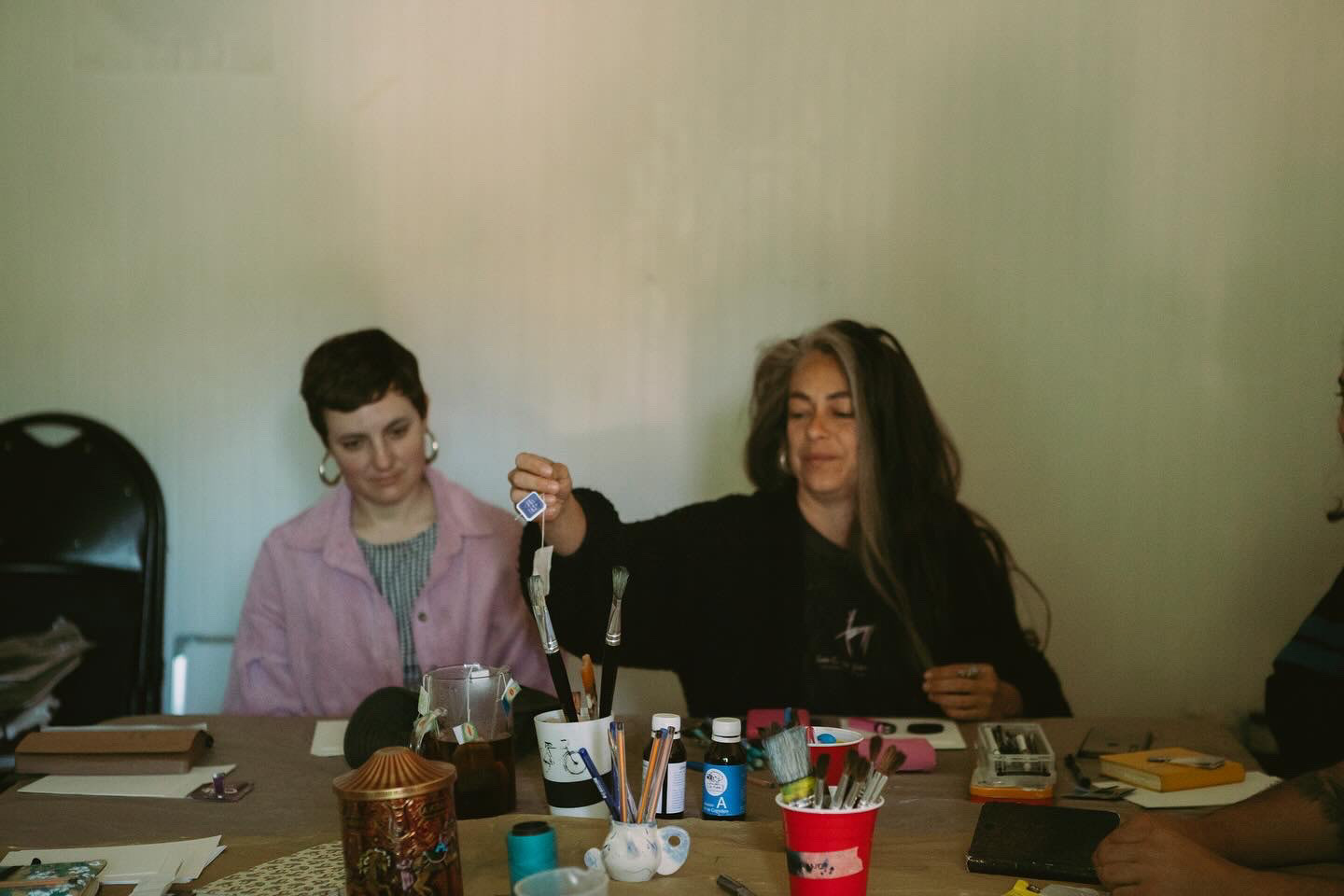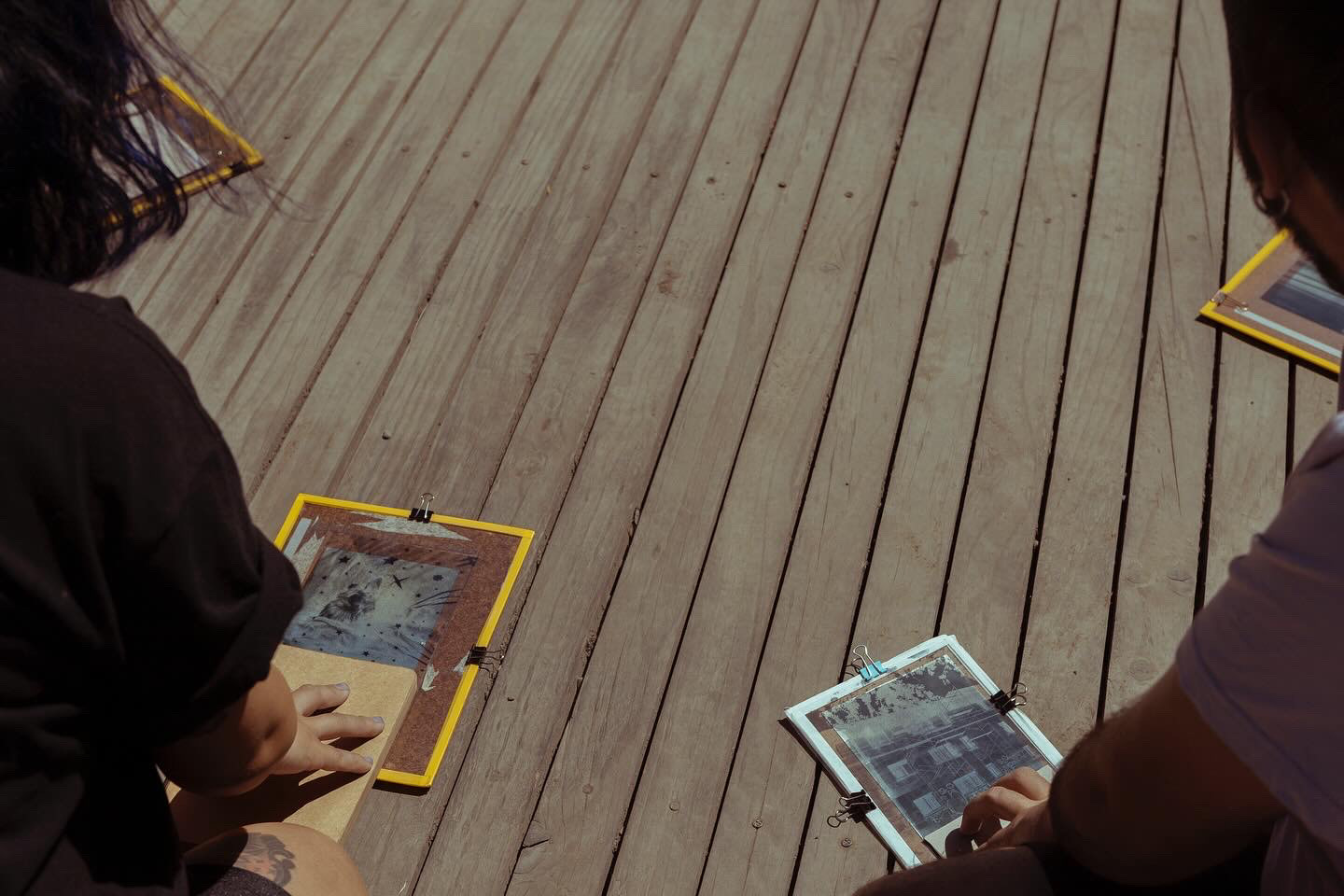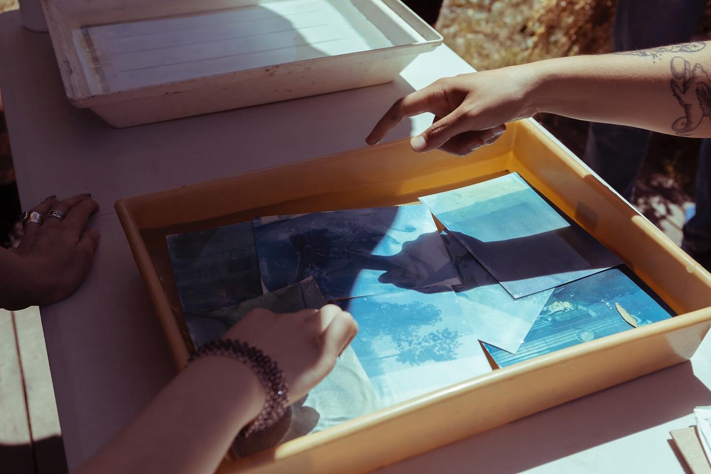 Experiencia de creación en torno a la noción de curar, vinculada al sanar y al curatoriar, que implica crear un relato, seleccionar las penas y prepararlas en conjunto. Para ello, se realizó una serie de sesiones grupales, culminando con una sesión abierta y extendida en Galería Barrios Bajos. En este espacio de creación colectiva, nos reunimos para abordar la tristeza a través del archivo personal, generando imágenes reveladas e intervenidas mediante cianotipia, creando un universo azul que surgió del aprendizaje de la técnica, el diálogo y la escucha atenta, la escritura, así como del ejercicio curatorial, acompañado de la toma y utilización de té como brebaje vincular. Autoras/es y facilitadoras/es: Fabiola Pontigo, Gabriel Correa y Valentina Inostroza.